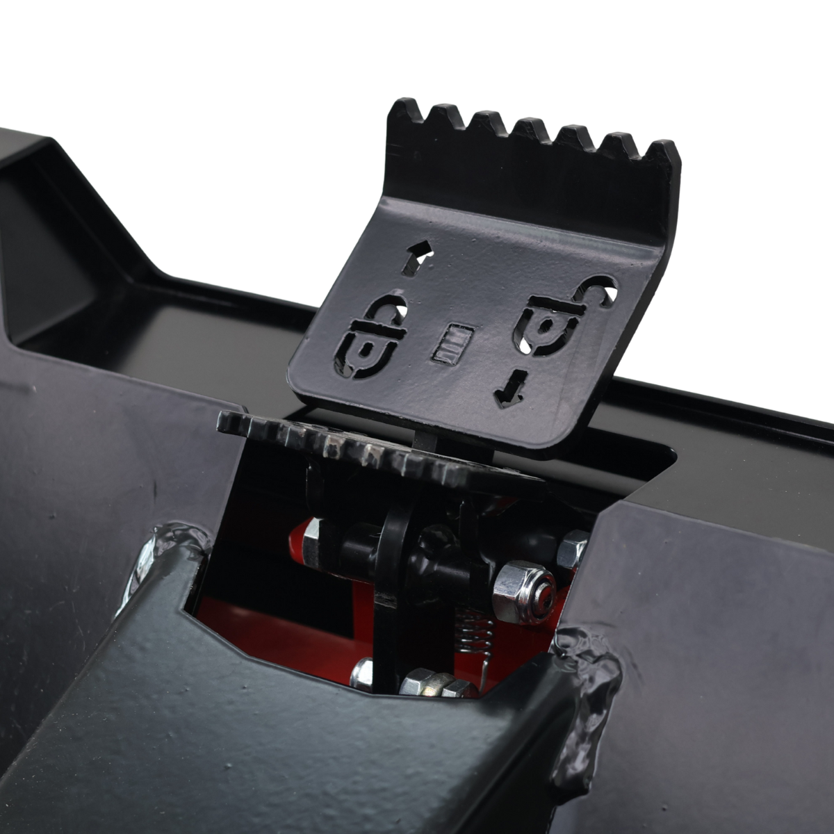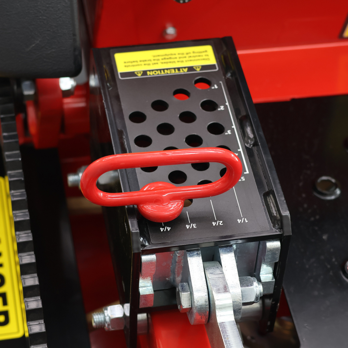 La hauteur de coupe se règle à l'aide d'une pédale et s'étend de 3,8 cm à 12,7 cm.