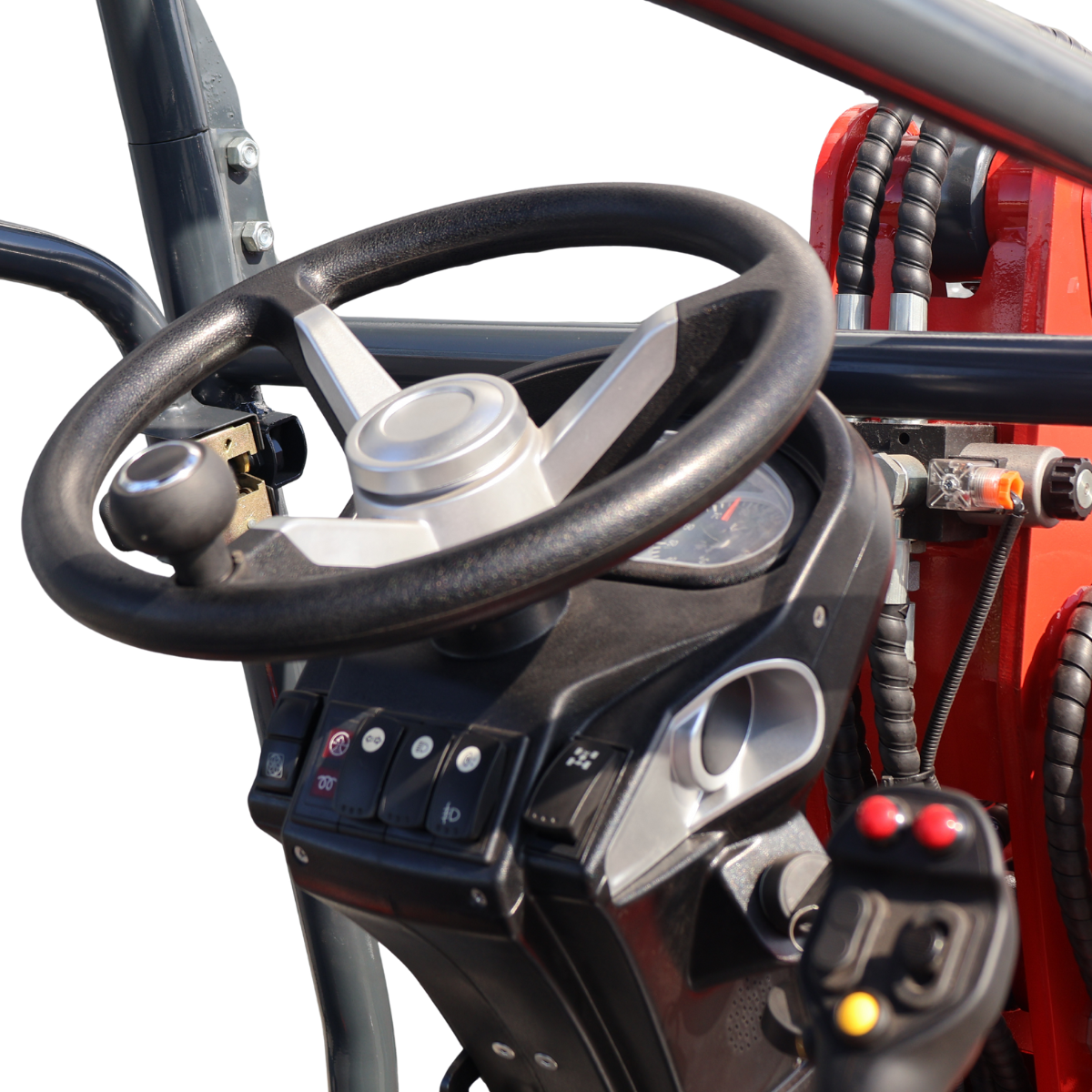 Dzięki kompaktowym rozmiarom łatwiej operuje się ładowarką na terenie z przeszkodami, a także łatwiej schować ją w garażu lub stodole. (2700mmx1180mmx2150mm)