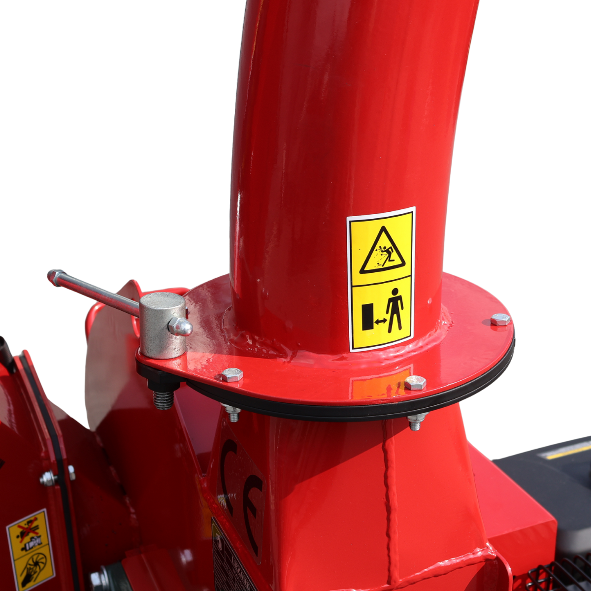 Rozdrabniacz wyrzuca materiał poprzez szeroki lej wylotowy z opcją ustawienia kierunku wylotu.